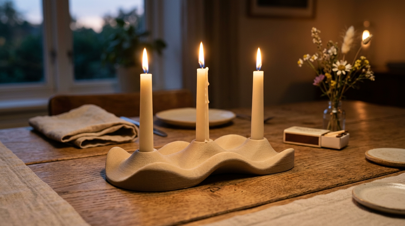 Chaque objet Volutea naît d'un trait sur un carnet, traverse plusieurs prototypes, puis s'imprime couche après couche pendant quelques heures à deux jours. Nous finissons chaque pièce à la main : ponçage, cire, numérotation.