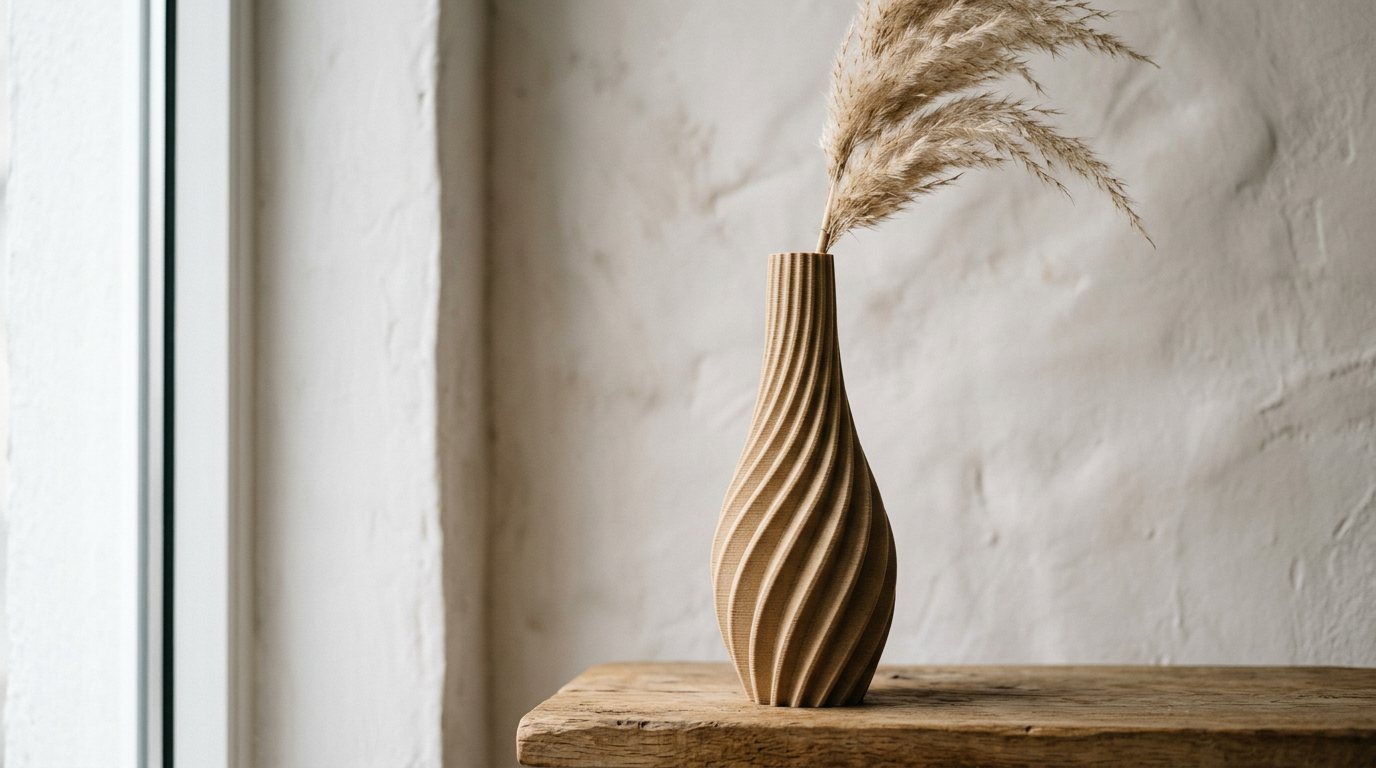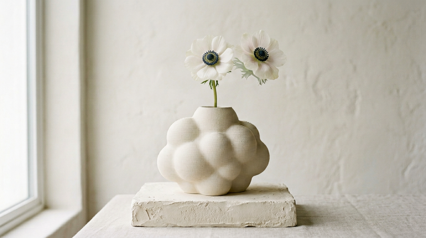 Volutea dessine et imprime en 3D des vases, luminaires et sculptures dans son atelier près du Canal Saint-Martin. Matériaux biosourcés, finitions à la main, éditions limitées.
